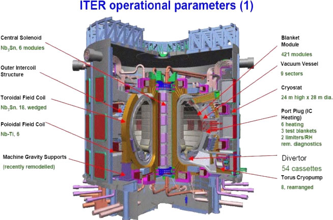 Мне повезло, в конце своей деятельности на фирме в Германии я оказался в команде, готовившей предложения по участию в изготовлении частей дивертора (нижней части тороидальной камеры) для установки ИТЕР, прототипа термоядерного реактора, строящегося во Франции при участии ЕС, России, США, Китая, Индии Японии и Кореи. Я не буду останавливаться на истории этого проекта, об этом написано много и, при желании, можно найти в интернете всю информацию. Не факт, что этот проект приведёт к массовому освоению термоядерной энергии, также не факт, что реализуемый в нём принцип «токамака», предложенный ещё в СССР является лучшим. Очевидно одно, что втечение более 50 лет с момента создания термоядерной бомбы, человечество так и не смогло обуздать термояд.