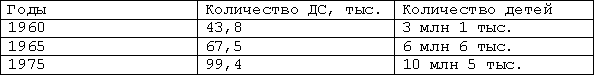 В 1963–1964 гг. разработана и апробирована первая комплексная программа «Воспитание в ДС». В результате совершенствования этой программы была создана программа «Воспитание и обучение в ДС». О росте числа ДС и количестве детей, занятых в системе дошкольного воспитания, представление дает следующая таблица: