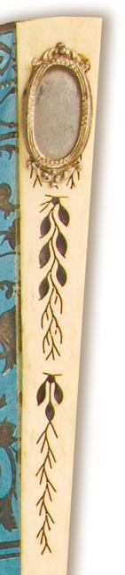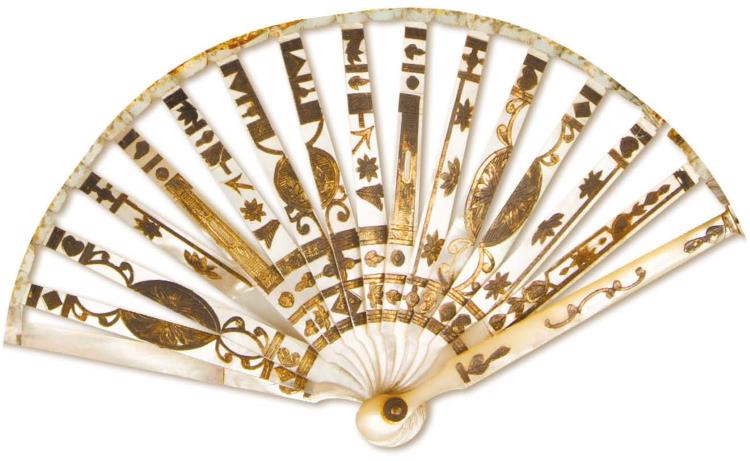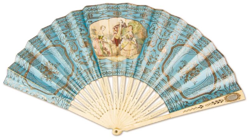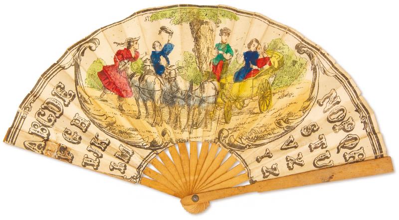 Веер плие, бумага, печать, раскрашенная гравюра. Остов: кость, резьба, металл, зеркальце.