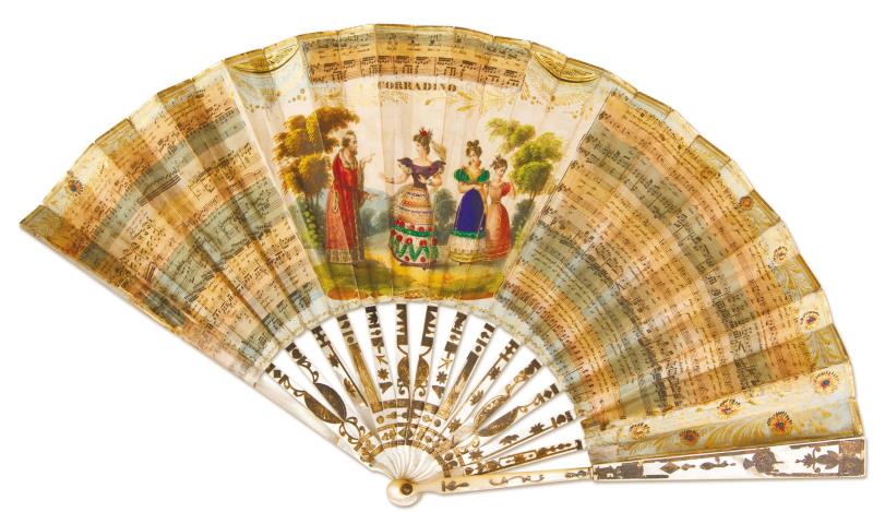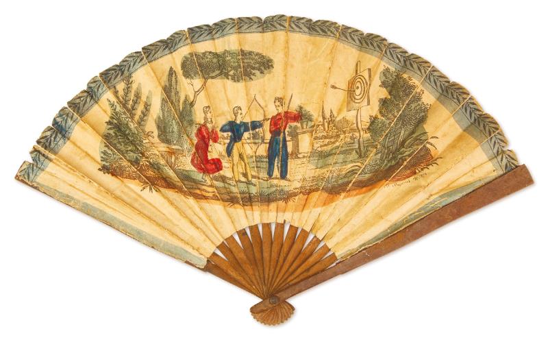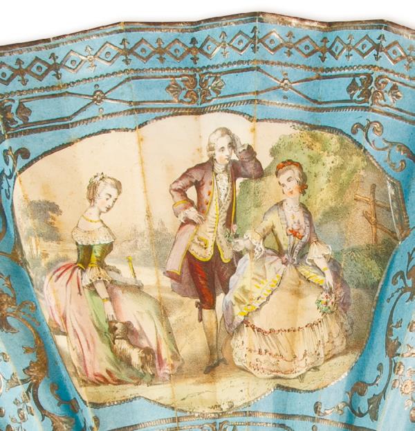 Веер плие, бумага, печать, раскрашенная гравюра.
