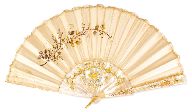 Веер плие, шелк, вышивка, кружевная тесьма.