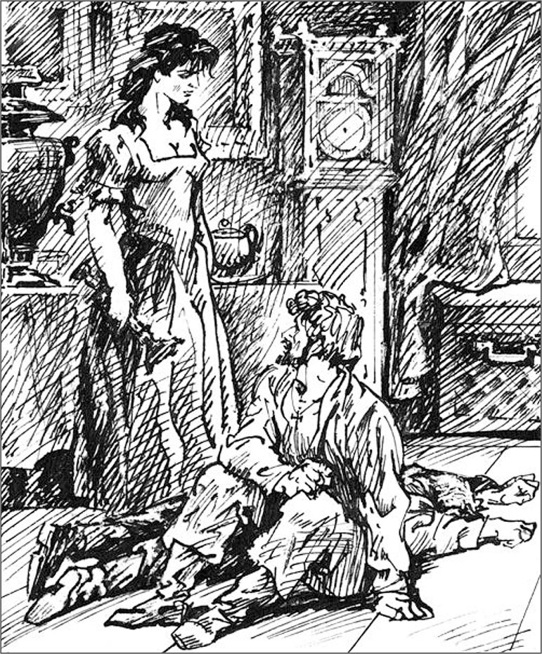 Катерина Львовна взошла к Феде, а он сидит на постели в своем беличьем тулупчике и читает патерик.