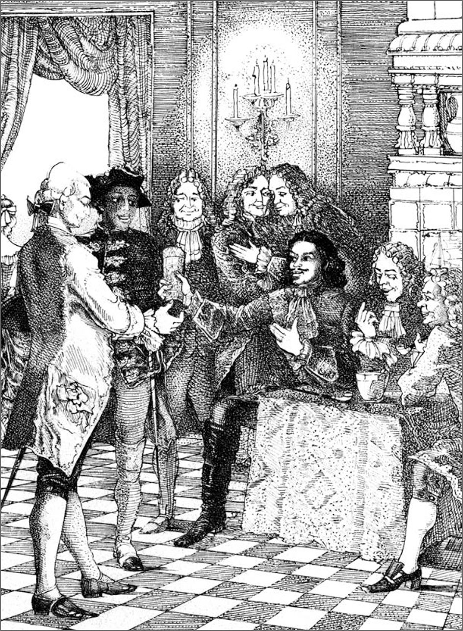 Ибрагим, по своему обыкновению, хотел заняться делом, но воображение его слишком было развлечено. Он оставил бумаги и пошел бродить по невской набережной. Вдруг услышал он голос Петра; оглянулся и увидел государя, который, отпустив сани, шел за ним с веселым видом. «Все, брат, кончено, – сказал Петр, взяв его под руку. – Я тебя сосватал. Завтра поезжай к своему тестю; но смотри, потешь его боярскую спесь: оставь сани у ворот, пройди через двор пешком, поговори с ним о его заслугах, о знатности – и он будет от тебя без памяти. Теперь, – продолжал он, потряхивая дубинкою, – заведи меня к плуту Данилычу, с которым надо мне переведаться за его новые проказы».