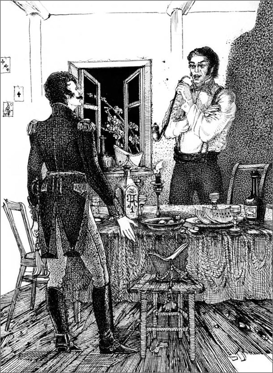 Один только человек принадлежал нашему обществу, не будучи военным. Ему было около тридцати пяти лет, и мы за то почитали его стариком. Опытность давала ему перед нами многие преимущества; к тому же его обыкновенная угрюмость, крутой нрав и злой язык имели сильное влияние на молодые наши умы. Какая-то таинственность окружала его судьбу; он казался русским, а носил иностранное имя. Некогда он служил в гусарах, и даже счастливо; никто не знал причины, побудившей его выйти в отставку и поселиться в бедном местечке, где жил он вместе и бедно и расточительно: ходил вечно пешком, в изношенном черном сюртуке, а держал открытый стол для всех офицеров нашего полка. Правда, обед его состоял из двух или трех блюд, изготовленных отставным солдатом, но шампанское лилось притом рекою. Никто не знал ни его состояния, ни его доходов, и никто не осмеливался о том его спрашивать. У него водились книги, большею частию военные, да романы. Он охотно давал их читать, никогда не требуя их назад; зато никогда не возвращал хозяину книги, им занятой. Главное упражнение его состояло в стрельбе из пистолета. Стены его комнаты были все источены пулями, все в скважинах, как соты пчелиные. Богатое собрание пистолетов было единственной роскошью бедной мазанки, где он жил. Искусство, до коего достиг он, было неимоверно, и если б он вызвался пулей сбить грушу с фуражки кого б то ни было, никто б в нашем полку не усомнился подставить ему своей головы. Разговор между нами касался часто поединков; Сильвио (так назову его) никогда в него не вмешивался. На вопрос, случалось ли ему драться, отвечал он сухо, что случалось, но в подробности не входил, и видно было, что таковые вопросы были ему неприятны. Мы полагали, что на совести его лежала какая-нибудь несчастная жертва его ужасного искусства. Впрочем, нам и в голову не приходило подозревать в нем что-нибудь похожее на робость. Есть люди, коих одна наружность удаляет таковые подозрения. Нечаянный случай всех нас изумил.