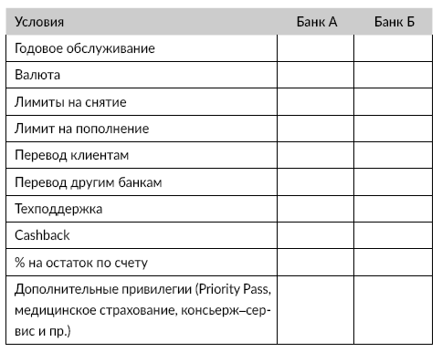 На моем онлайн-курсе «Мышление инвестора» я предлагаю небольшой чек-лист (рис. 1) с перечнем основных критериев для сравнения при выборе себе карты.