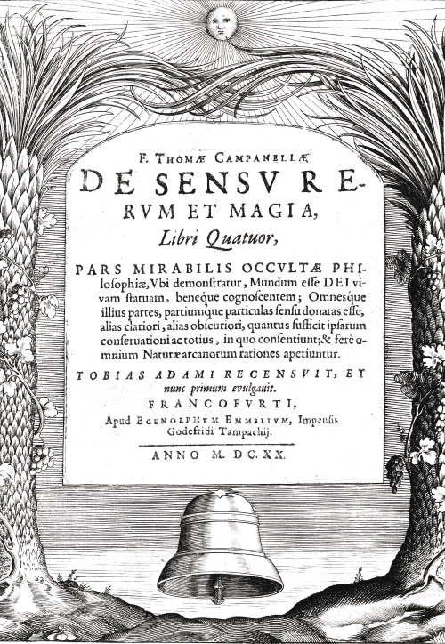[Пера] брата[-монаха] Томмазо Кампанеллы четыре книги о чувстве в вещах и о магии. Дивная часть тайной философии, в которой показывается, что мир – это хорошо познающее живое божье изваяние, а все части его и частички этих частей обладают чувством, одни – более ясным, другие – более смутным, в той мере, в какой необходимо, чтобы поддерживалась жизнь их и всего света, в коем они живут согласным чувством. И почти все основания тайн природы [в коей книге] открываются.