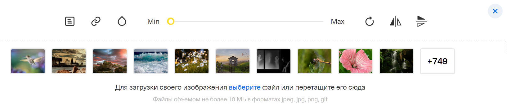 Для изменения изображения – просто нажмите на него и снизу откроется окно с доступными опциями. В данном окне можно выбрать картинку среди предлагаемых вариантов или загрузить свою, кликнув по ссылке.