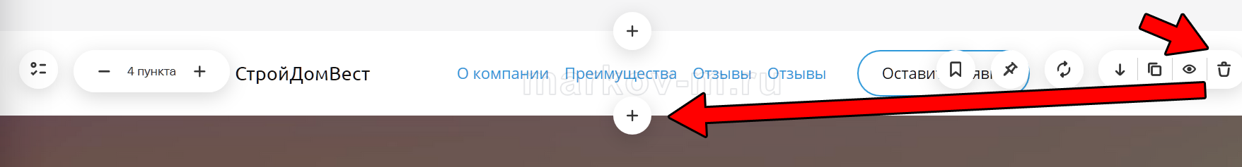 По умолчанию в шаблоне «Универсальная страница» указан неплохой шаблон блока верхней шапки(меню страницы), но если вы хотите изменить расположение элементов в верхней шапке(меню страницы), то наведите мышкой на верхнюю шапку(при просмотре с компьютера) или кликните на значок верхней шапки с 3 точками(при просмотре с телефона). У вас появятся доступные операции с блоком, описанные выше. Функция «Заменить» обладает ограниченным выбором, поэтому вместо нее кликаем «удалить» блок, чтобы потом на это место вставить другой.
