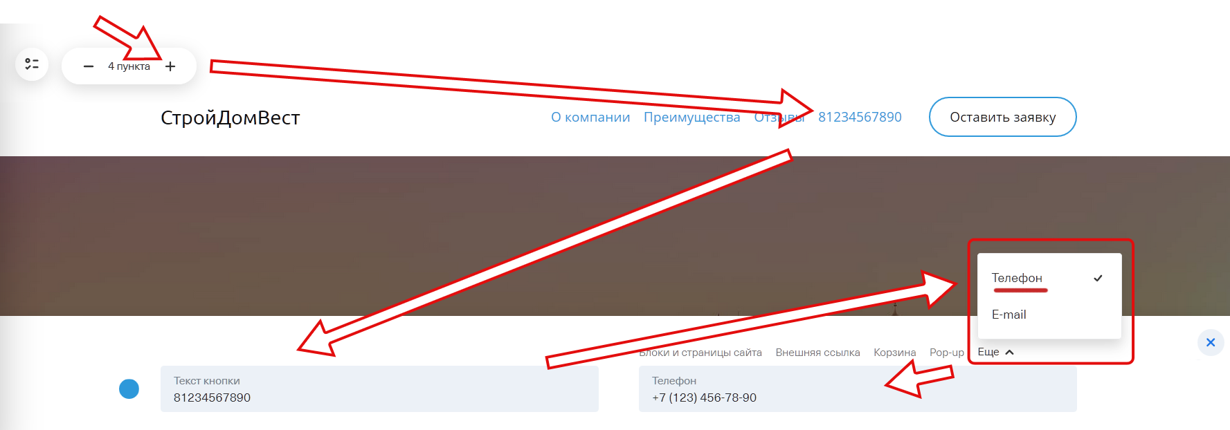 1 Вариант. Если в вашем шаблоне верхней шапки нет поля телефона, то его можно добавить в меню. Для этого добавим в меню еще один пункт, кликаем по блоку слева на «+»(или «Добавить». Если не отображается, то перед этим нажать на значок изменения структуры блока слева сверху), затем по вновь появившемуся пункту меню(если меню скрыто, то перед этим нажать на значок 3 полоски), далее в поле «текст кнопки» пишем контактный телефон, а в графе типа ссылки выбираем «Телефон» и вводим.