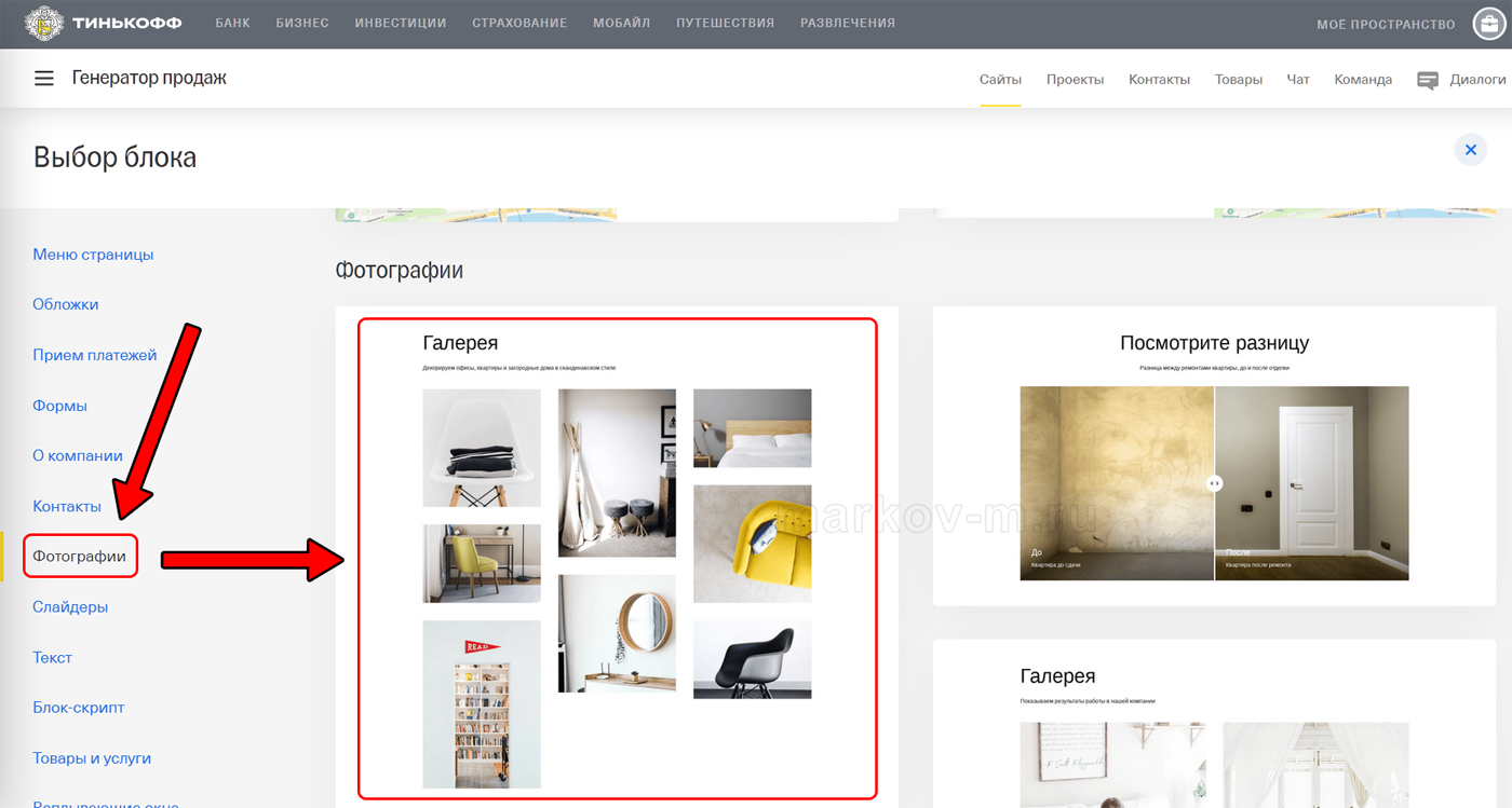 Хороший вариант блока небольшой фотогалереи в конструкторе сайтов Тинькофф