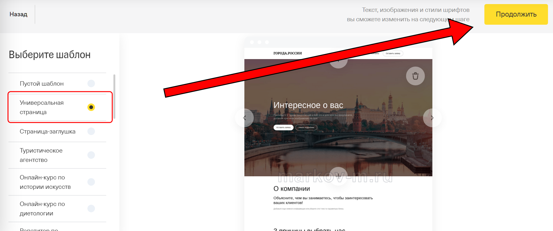 Выбираем шаблон «Универсальная страница» т. к. именно этот шаблон, позволит быстрее разобраться в конструкторе сайтов. А после изучения инструкции уже выберите то, что больше нравится.