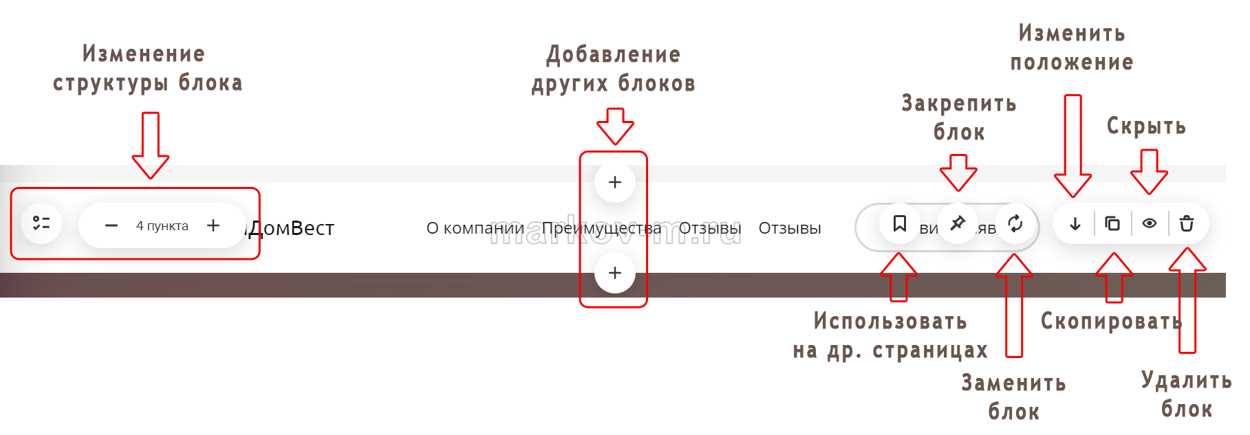 Сейчас мы кратко рассмотрим основные операции с шаблоном страницы, которые понадобятся в дальнейшем. Сайт состоит из различных блоков. Для изменения блока – наведите мышкой на него(при просмотре с компьютера) или кликните на значок с 3 точками(при просмотре с телефона). Значения каждого значка подписано ниже.