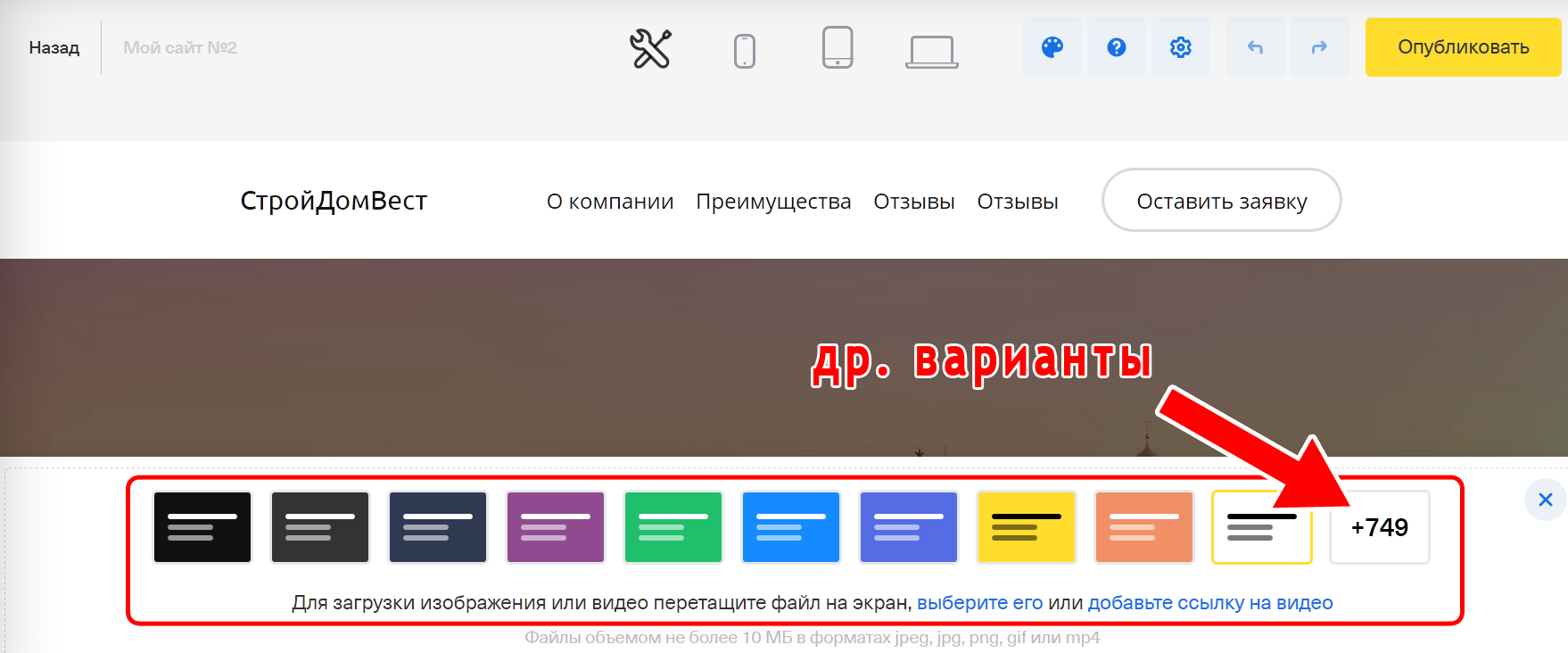 Чтобы содержание не смотрелось слишком однообразно и скучно можно сделать сайт с разными цветами фона блоков или даже загрузить фоновое изображение на задний план. Для этого нажмите пустое место блока и появятся доступные опции. Кликнув на последнюю ссылку с другими вариантами, появится возможность добавить: иллюстрации, фотографии, градиенты и прочее.