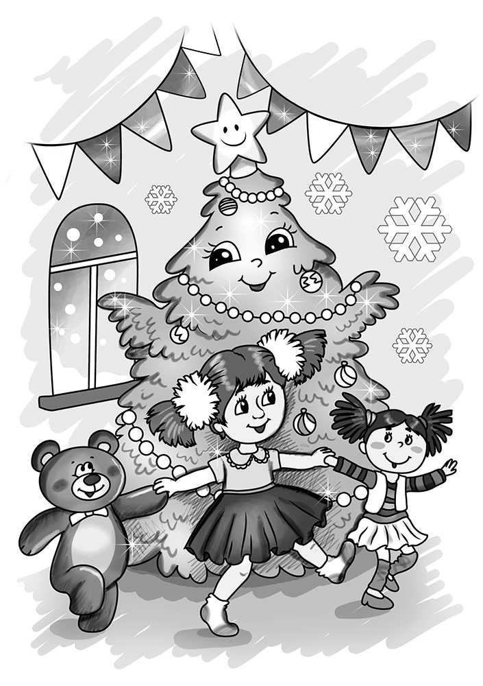 Возле ёлки в Новый годВсе водили хоровод.День обычный настаёт –Внучка загрустила,Ведь двоим-то хороводНам и не под силу…На работе мама с папой?Мишку мы возьмём за лапу,А другой рукой возьмёмКуколку за ручку –Снова кружит хороводДля малышки внучки.
