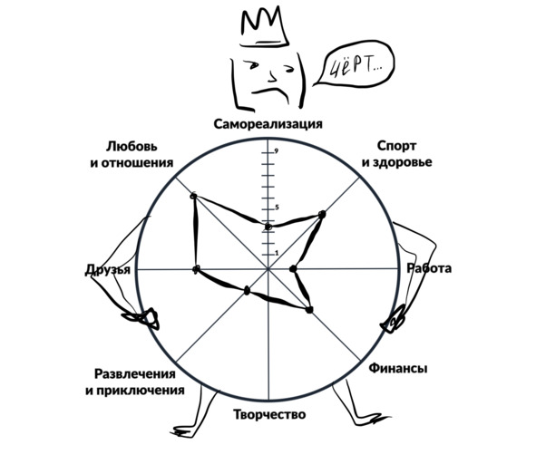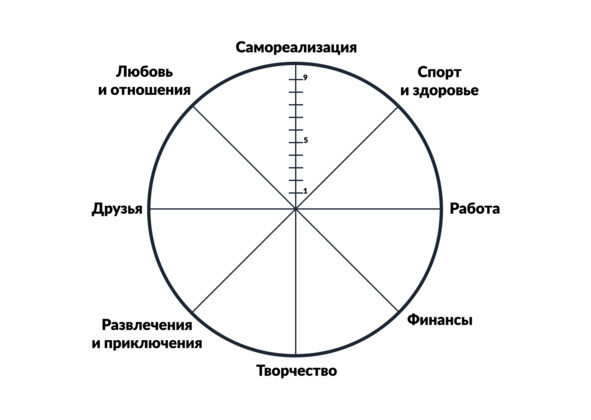 Теперь, когда у вас есть ориентиры, постарайтесь максимально честно оценить текущее положение и вашу удовлетворённость им в каждом из секторов. Заполненный «круг жизни» будет выглядеть как-то так: