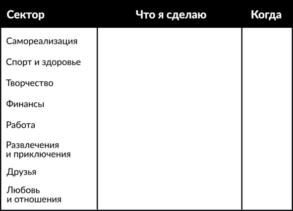 Поделюсь секретом: на самом деле, меньше чем за месяц вы можете поднять оценку по каждому из секторов на 1—2 балла. Универсальных рецептов, конечно, нет: кому-то, возможно, нужно начать гулять по вечерам, купить акрил и выделить по 15 минут в день на рисование, другим – договориться с друзьями о запланированных регулярных встречах, поговорить с партнёром или настроить копилку в банковском приложении. В любом случае, это должны быть несложные действия, результат от которых пусть и небольшой, но ощутимый лично для вас. Давайте сформулируем и запланируем их: