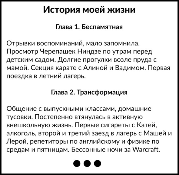 В повседневной обстановке мы воспринимаем жизнь довольно разрозненно: есть настоящий момент, в который мы максимально включены (день и неделя), плюс немного в сторонке стоит блок свежих событий и впечатлений за последние пару месяцев. А всё, что случалось до этого, будто бы сжато в ZIP-архив. Вроде было, помним, но обычно не держим в голове по порядку и не выстраиваем полную нить истории каждый раз, как думаем о себе. Такая схема полезна, потому что она экономит ресурсы мозга для важных текущих дел, но в то же время разрозненность мешает оценивать жизнь целиком и планировать будущее. Тот, кто не видит полной картины, не может полноценно управлять происходящим. Словно вас заставили дописывать книгу, которую вы начали в четырнадцать, но перечитать разрешают только последние три страницы. Кто все эти герои, какой сюжет, куда они двигаются?