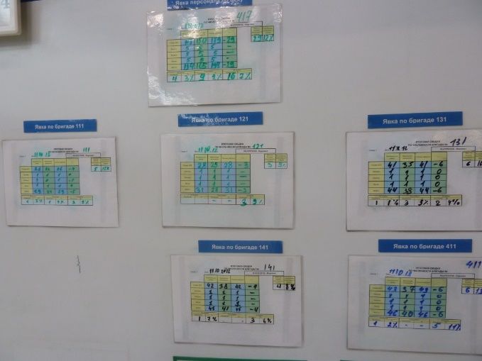 Проблемы также фиксируются в письменном виде в соответствующие формы на информационном центре. Одно из преимуществ системы с точки зрения представления информации заключается в том, что все видят взаимосвязь отклонений и проблем. Другими словами, сформулированная и записанная проблема должна обязательно влиять на отклонение того или иного показателя от норматива, т.е. решив проблему с большой вероятностью отклонение в значении ключевого показателя должно исчезнуть. Таким образом, вряд ли кто-то будет писать удобную, простую, или не обдуманную проблему. Это приучает людей к культуре прозрачности, приучает не скрывать, а наоборот – выносить и показывать проблемы, решая их лицом к лицу.