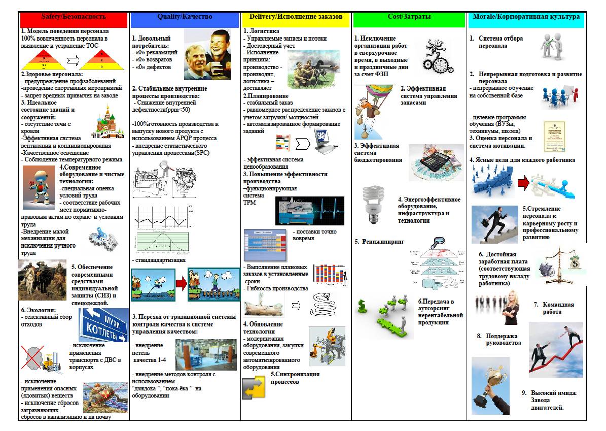 Следующий пример – визуализированная форма тактического плана реализации определённых работ. Такие формы плана часто размещают на информационном центре (например, план работ цеха на год), в проектных комнатах (например, план реализации проекта) или в любом месте реализации работ. Подробней о структуре, подходах к разработке таких планов, а также о правилах работы с ними вы можете прочитать в книге «Реализация стратегии по принципу «Заказчик – Поставщик».