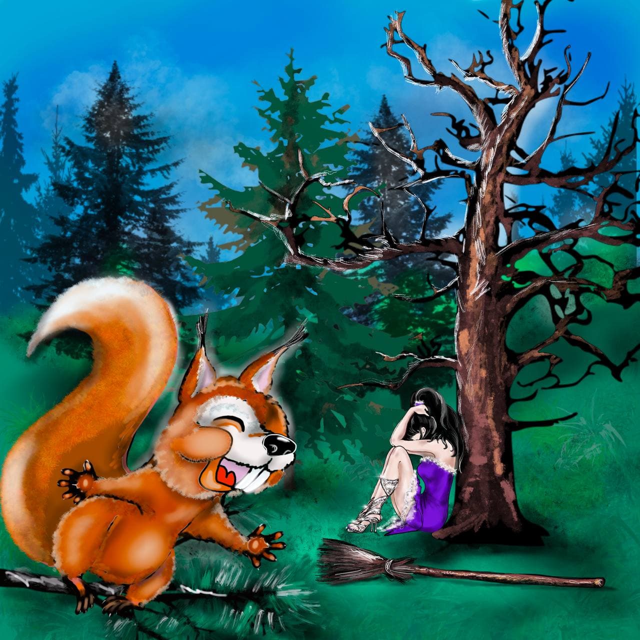 Залетев подальше, в чащу леса, она приземлилась там, где потемнее и стала злобно колотить ручками ствол большой сосны. Через несколько мгновений она услышала писк. Это маленькая белка, у которой было дупло в этой самой сосне, сбежала вниз посмотреть, кто устроил ей землетрясение.