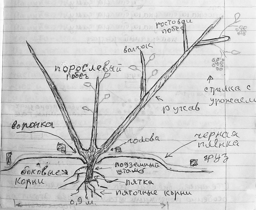 II. Схема виноградного кустаПрошу сразу усвоить некоторые термины, которые нам понадобятся. Часть из них проиллюстрирую схемой виноградного куста веерной формировки на два рукава. Схема упрощенная – показаны лишь отдельные части куста для введения в терминологию, принятую у виноградарей. Надо сказать, что в разных местностях термины могут отличаться от стандарта.