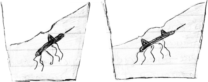 Если почки прорастут на разных концах подземного штамба (на рисунке справа), постарайтесь вырастить оба побега и посадить саженец в грунт почти горизонтально. На другой год можно аккуратно разрезать подземный штамб и отсадить одну часть.