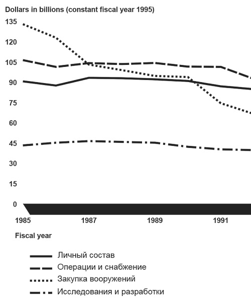Вместе с тем, структура сокращения военных расходов США во второй половине 1980-х годов оказалась крайне неблагоприятной для американской оборонной промышленности. Как видно из нижеприведенного графика, основной удар пришелся на сферу закупок вооружений и военной техники, то есть сферу, напрямую связанную с ВПК. Если в области исследований и разработок и содержания личного состава, расходы оставались относительно стабильными, а в области операций и снабжения произошло лишь небольшое их снижение, то в сфере закупок имел место резкий спад. Расходы приведены в постоянных ценах 1995 года.