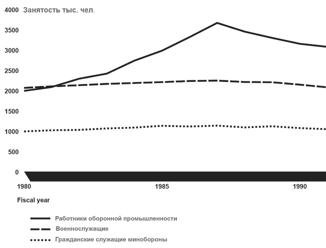 На графике показано, что, занятость в оборонной промышленности быстро росла, начиная с 1980 года, и достигла пика примерно в 1987 году. В абсолютных цифрах численность работающих в этой отрасли увеличилась с 2 миллионов человек до почти 4 миллиона человек, то есть почти в 2 раза. Однако, затем количество работников оборонной промышленности начало стабильно сокращаться.