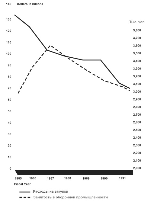 Рис. 1.4. Расходы на закупки Министерства обороны и занятость в оборонной промышленности США в 1985–1991 гг.[12]