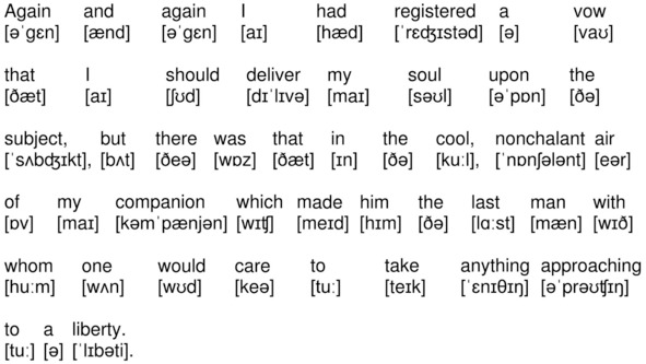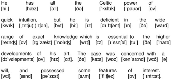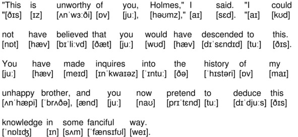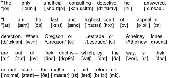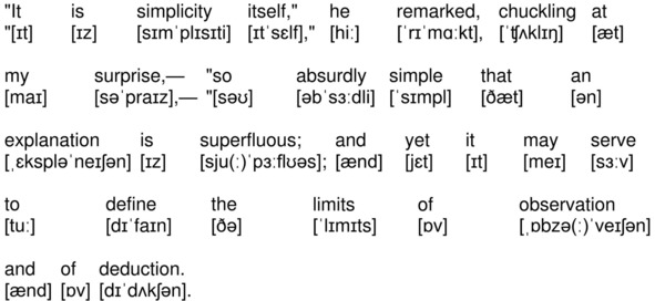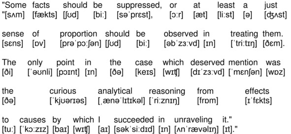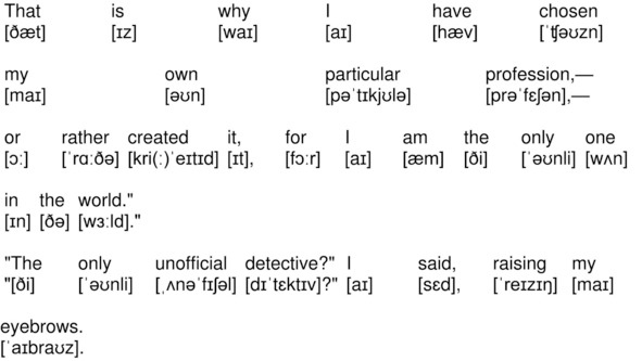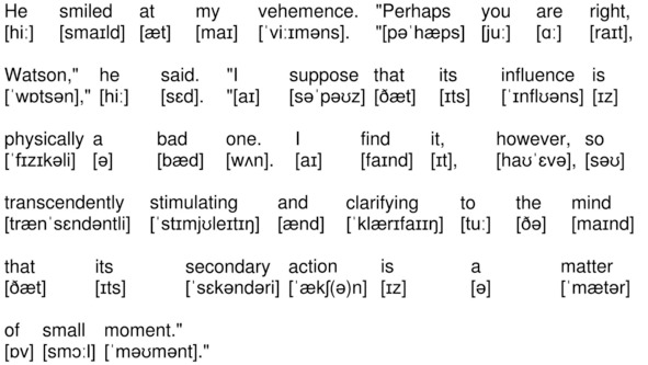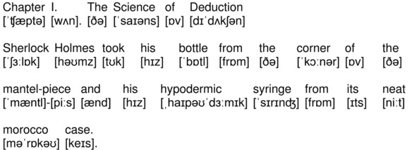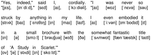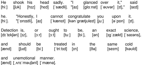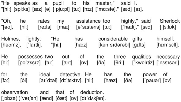На канале YouTube опубликована аудиокнига по повести А. К. Дойла «Знак четырех» (The Sign of the Four by Sir Arthur Conan Doyle) на английском языке с синхронизированным текстом и транскрипцией. Для подготовки видеороликов использованы бесплатная аудиокнига с публичного сайта Librivox (https://librivox.org/the-sign-of-the-four-version-3-by-sir-arthur-conan-doyle/), озвученная носителем языка (David Clarke), и бесплатная электронная книга с публичного сайта Project Gutenberg (http://www.gutenberg.org/ebooks/2097). Транскрипция, записанная символами международного фонетического алфавита, выполнена с помощью онлайн-переводчика английского текста в транскрипцию. Автор онлайн-переводчика – Дмитрий Янс (https://tophonetics.com/ru/).
