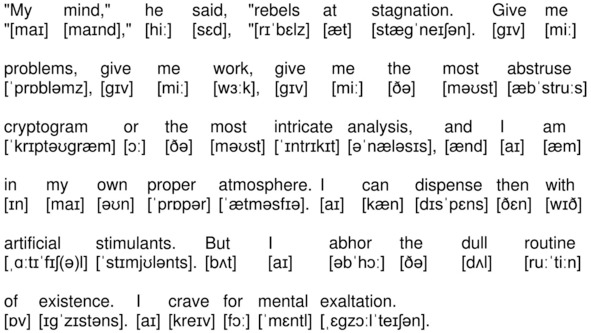 «My mind,» he said, «rebels at stagnation. Give me problems, give me work, give me the most abstruse cryptogram or the most intricate analysis, and I am in my own proper atmosphere. I can dispense then with artificial stimulants. But I abhor the dull routine of existence. I crave for mental exaltation.