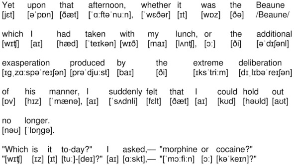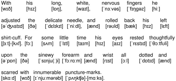 With his long, white, nervous fingers he adjusted the delicate needle, and rolled back his left shirt-cuff. For some little time his eyes rested thoughtfully upon the sinewy forearm and wrist all dotted and scarred with innumerable puncture-marks.