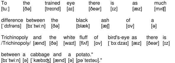 To the trained eye there is as much difference between the black ash of a Trichinopoly and the white fluff of bird’s-eye as there is between a cabbage and a potato.»