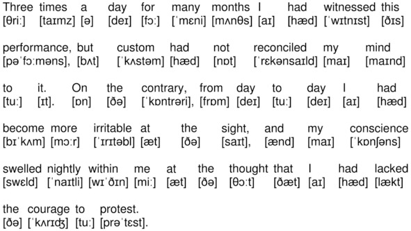 Three times a day for many months I had witnessed this performance, but custom had not reconciled my mind to it. On the contrary, from day to day I had become more irritable at the sight, and my conscience swelled nightly within me at the thought that I had lacked the courage to protest.