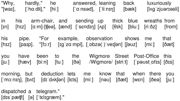 «Why, hardly,» he answered, leaning back luxuriously in his arm-chair, and sending up thick blue wreaths from his pipe. «For example, observation shows me that you have been to the Wigmore Street Post-Office this morning, but deduction lets me know that when there you dispatched a telegram.»