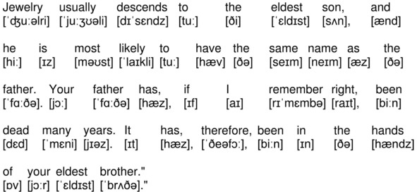 Jewelry usually descends to the eldest son, and he is most likely to have the same name as the father. Your father has, if I remember right, been dead many years. It has, therefore, been in the hands of your eldest brother.»