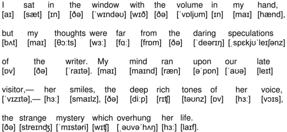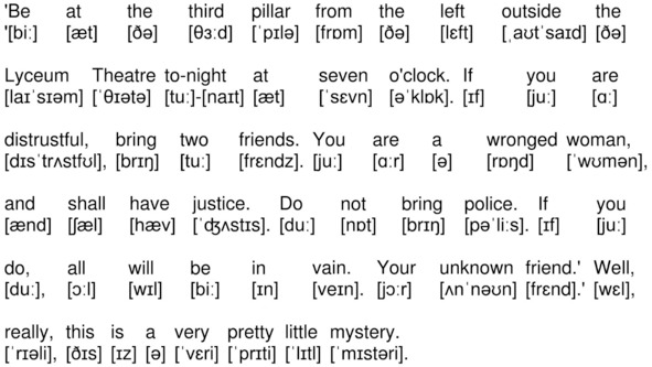 «Be at the third pillar from the left outside the Lyceum Theatre to-night at seven o’clock. If you are distrustful, bring two friends. You are a wronged woman, and shall have justice. Do not bring police. If you do, all will be in vain. Your unknown friend.» Well, really, this is a very pretty little mystery.