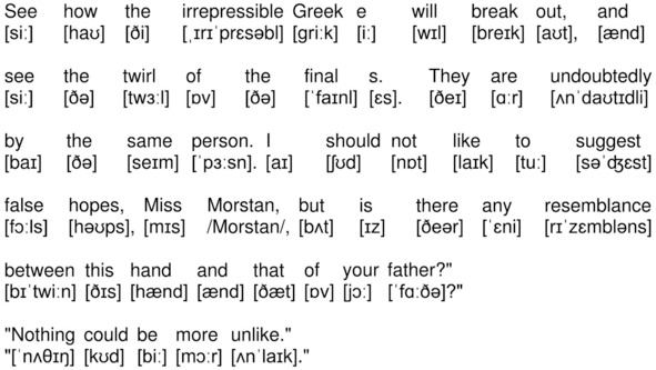See how the irrepressible Greek e will break out, and see the twirl of the final s. They are undoubtedly by the same person. I should not like to suggest false hopes, Miss Morstan, but is there any resemblance between this hand and that of your father?»
