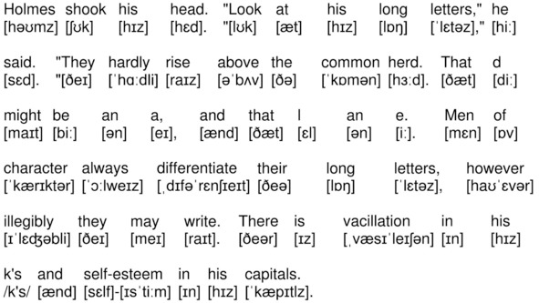 Holmes shook his head. «Look at his long letters,» he said. «They hardly rise above the common herd. That d might be an a, and that l an e. Men of character always differentiate their long letters, however illegibly they may write. There is vacillation in his k’s and self-esteem in his capitals.