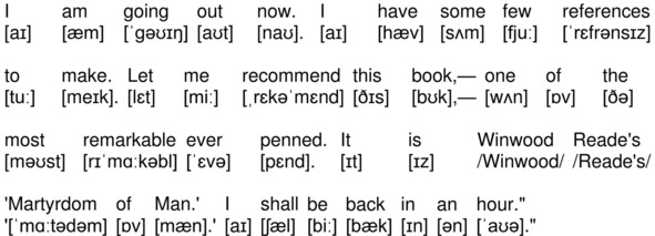 I am going out now. I have some few references to make. Let me recommend this book, – one of the most remarkable ever penned. It is Winwood Reade’s «Martyrdom of Man.» I shall be back in an hour.»
