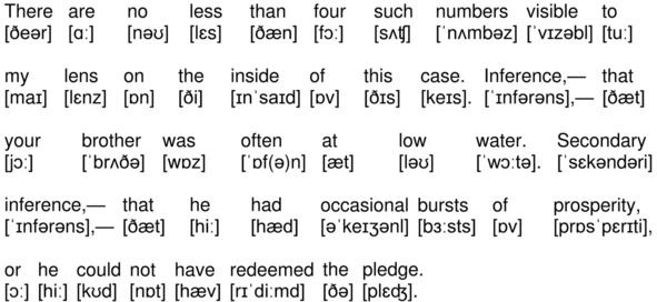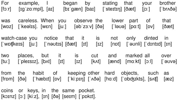 For example, I began by stating that your brother was careless. When you observe the lower part of that watch-case you notice that it is not only dinted in two places, but it is cut and marked all over from the habit of keeping other hard objects, such as coins or keys, in the same pocket.