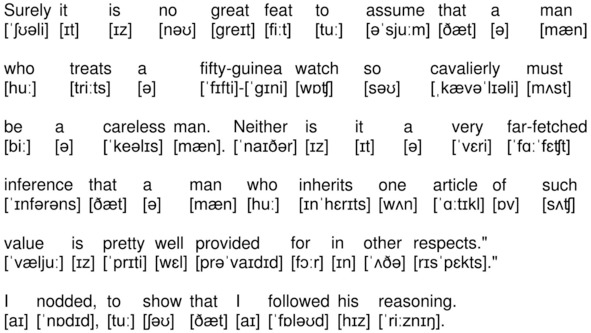 Surely it is no great feat to assume that a man who treats a fifty-guinea watch so cavalierly must be a careless man. Neither is it a very far-fetched inference that a man who inherits one article of such value is pretty well provided for in other respects.»