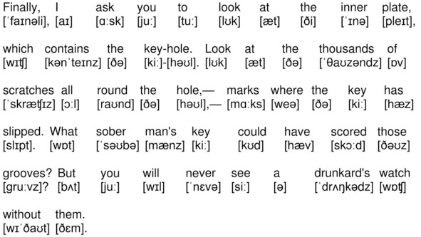 Finally, I ask you to look at the inner plate, which contains the key-hole. Look at the thousands of scratches all round the hole, – marks where the key has slipped. What sober man’s key could have scored those grooves? But you will never see a drunkard’s watch without them.