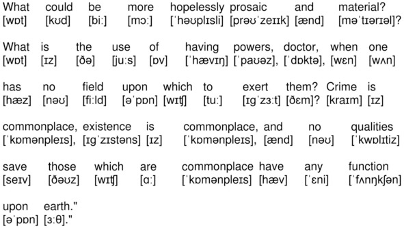 What could be more hopelessly prosaic and material? What is the use of having powers, doctor, when one has no field upon which to exert them? Crime is commonplace, existence is commonplace, and no qualities save those which are commonplace have any function upon earth.»
