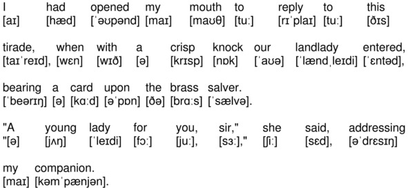 I had opened my mouth to reply to this tirade, when with a crisp knock our landlady entered, bearing a card upon the brass salver.