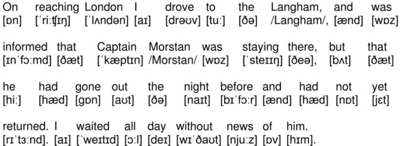 On reaching London I drove to the Langham, and was informed that Captain Morstan was staying there, but that he had gone out the night before and had not yet returned. I waited all day without news of him.