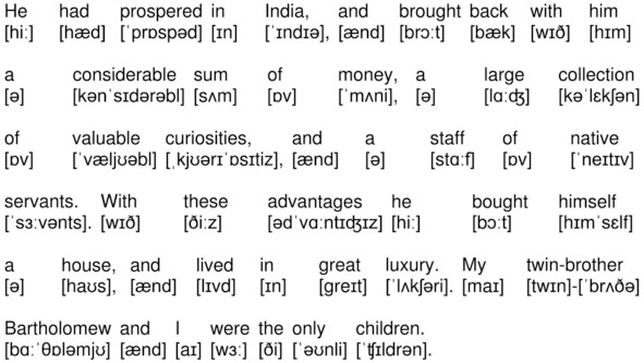 He had prospered in India, and brought back with him a considerable sum of money, a large collection of valuable curiosities, and a staff of native servants. With these advantages he bought himself a house, and lived in great luxury. My twin-brother Bartholomew and I were the only children.