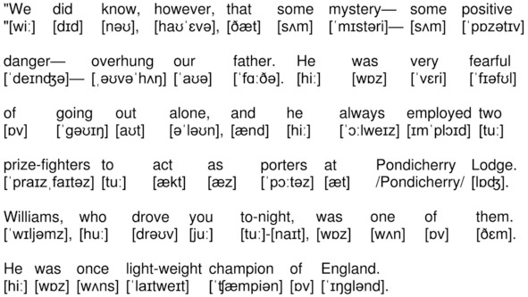 «We did know, however, that some mystery – some positive danger – overhung our father. He was very fearful of going out alone, and he always employed two prize-fighters to act as porters at Pondicherry Lodge. Williams, who drove you to-night, was one of them. He was once light-weight champion of England.