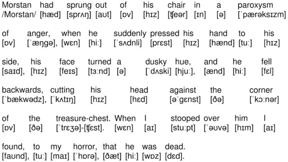 Morstan had sprung out of his chair in a paroxysm of anger, when he suddenly pressed his hand to his side, his face turned a dusky hue, and he fell backwards, cutting his head against the corner of the treasure-chest. When I stooped over him I found, to my horror, that he was dead.