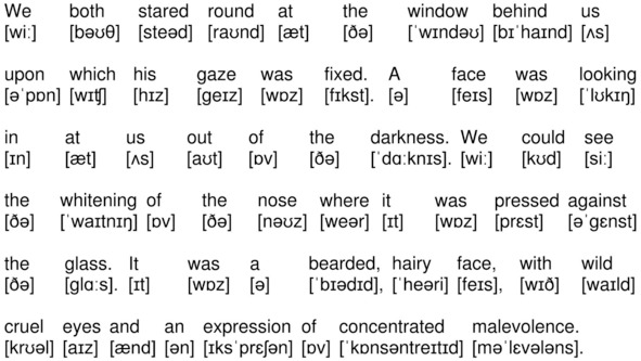 We both stared round at the window behind us upon which his gaze was fixed. A face was looking in at us out of the darkness. We could see the whitening of the nose where it was pressed against the glass. It was a bearded, hairy face, with wild cruel eyes and an expression of concentrated malevolence.